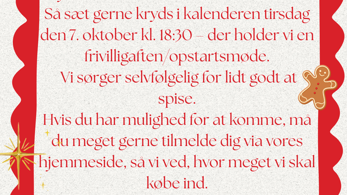 Så sæt gerne kryds i kalenderen tirsdag den 7. oktober kl. 18:30 – der holder vi en frivilligaften/opstartsmøde.